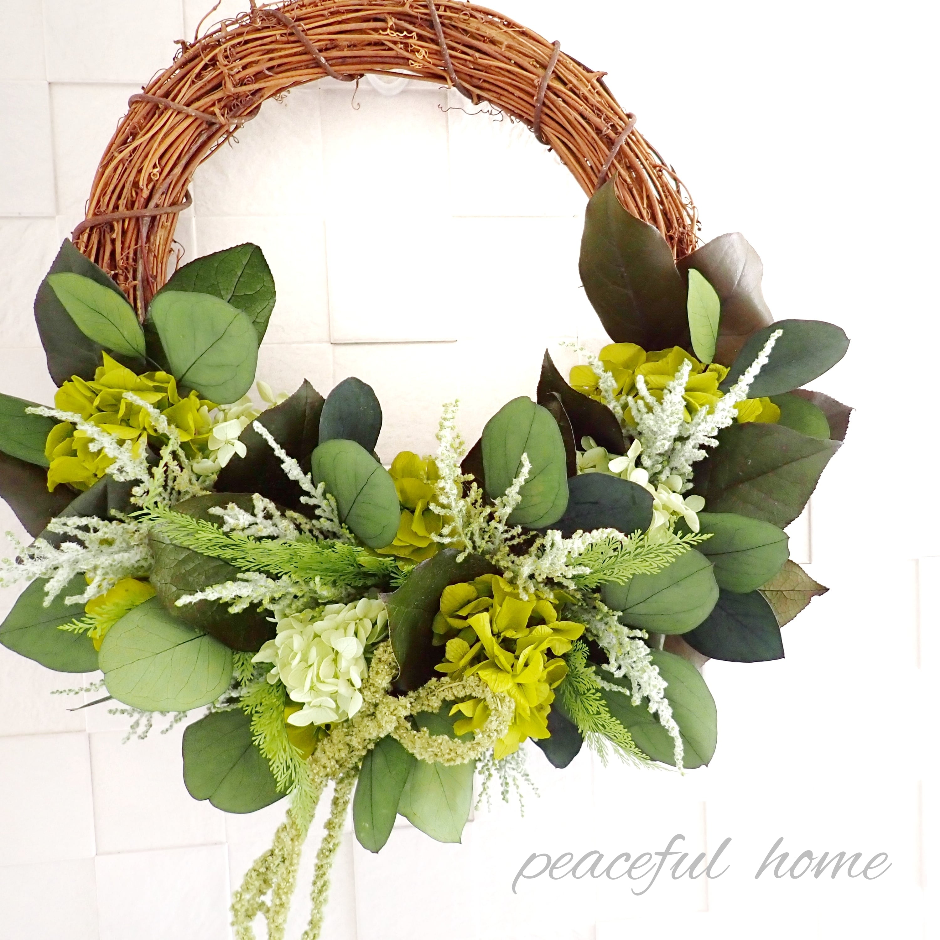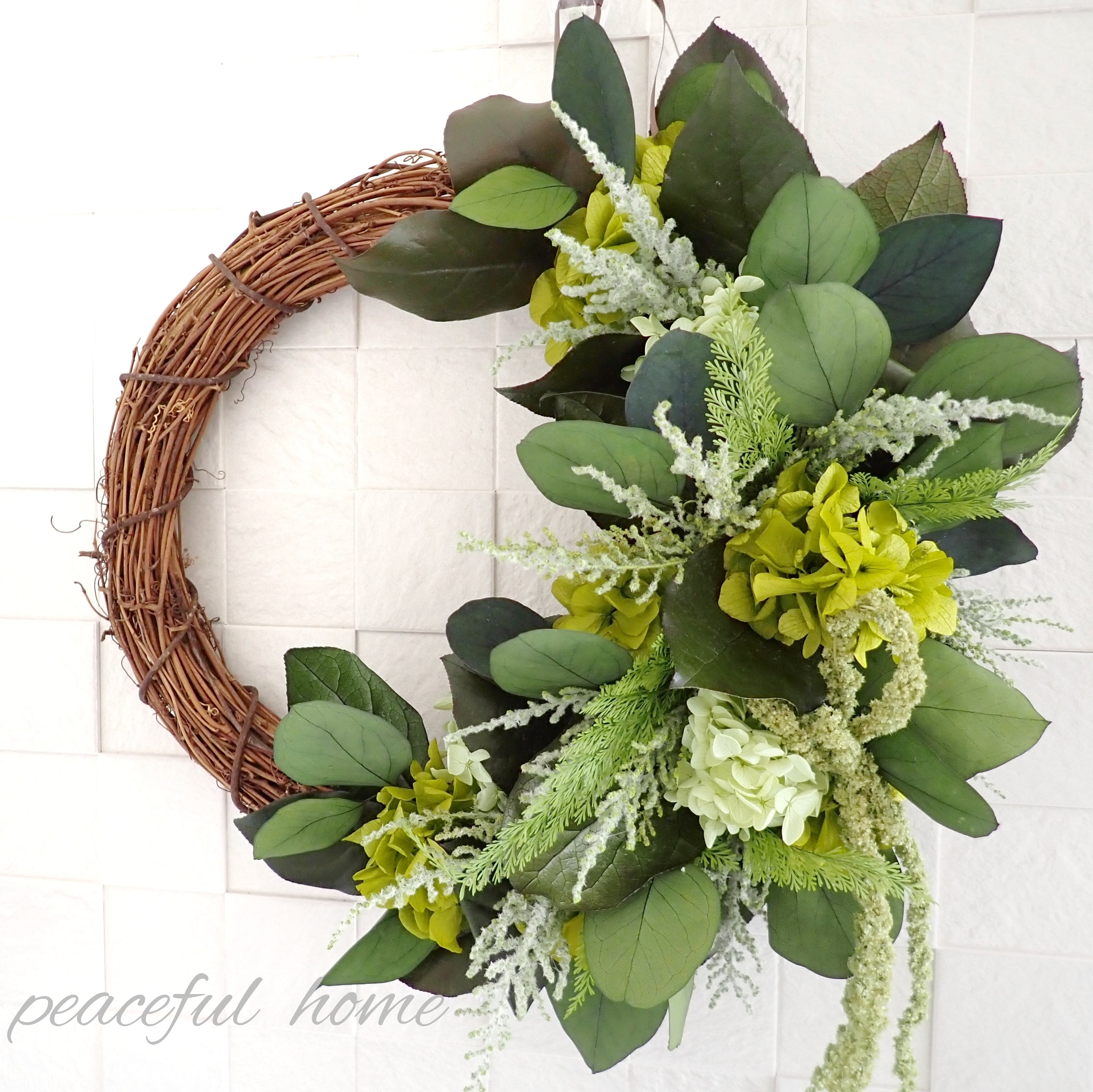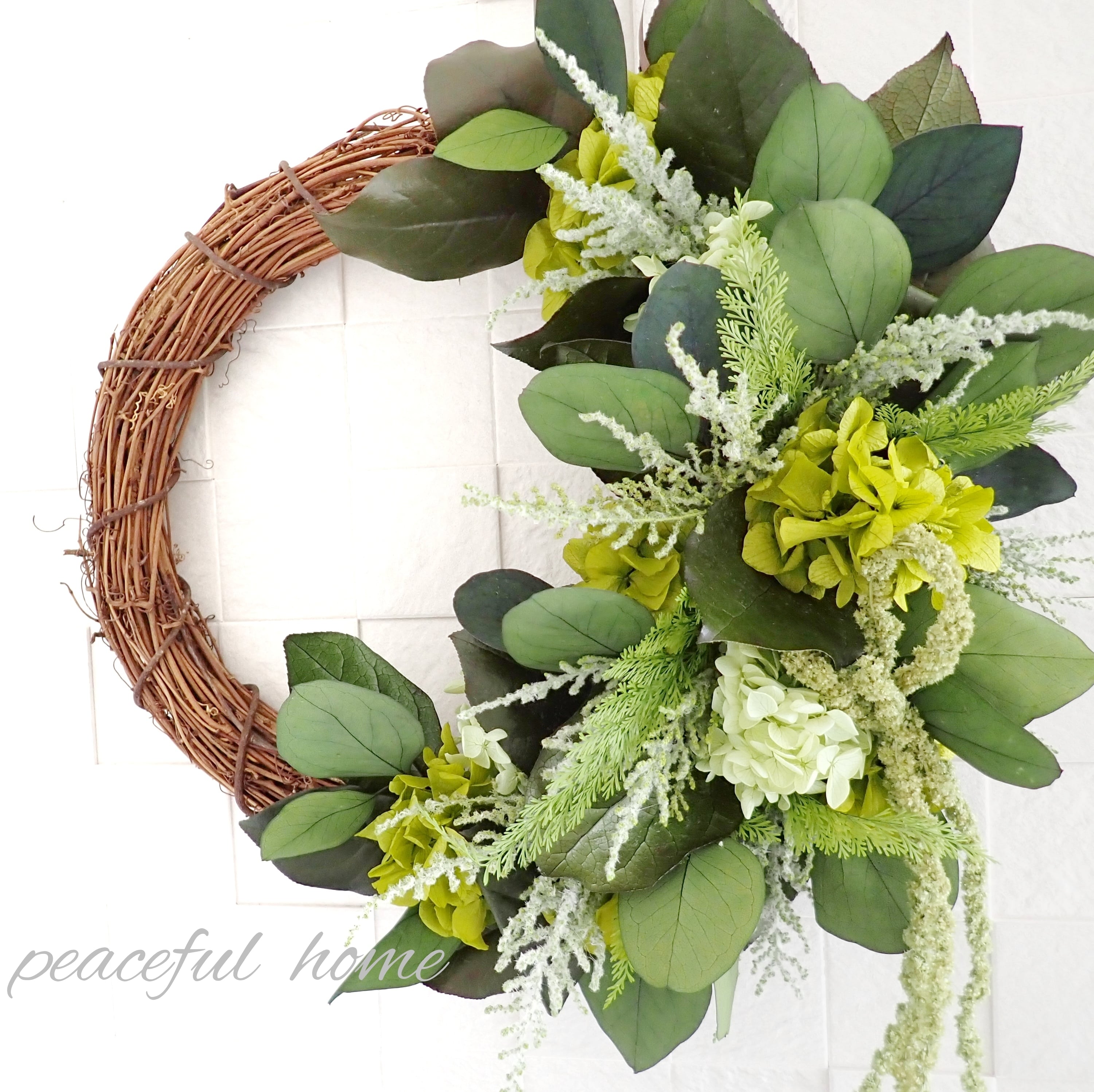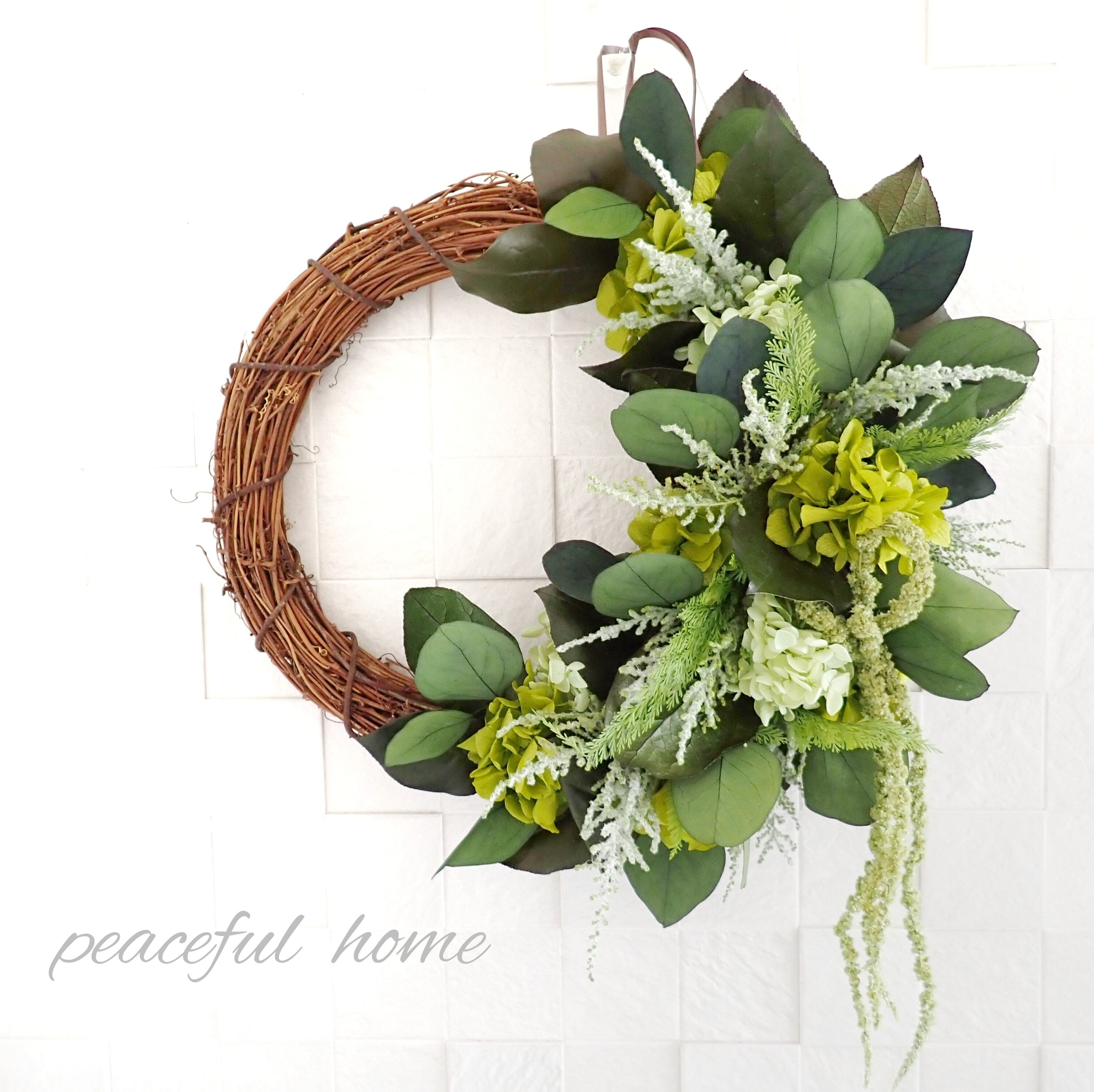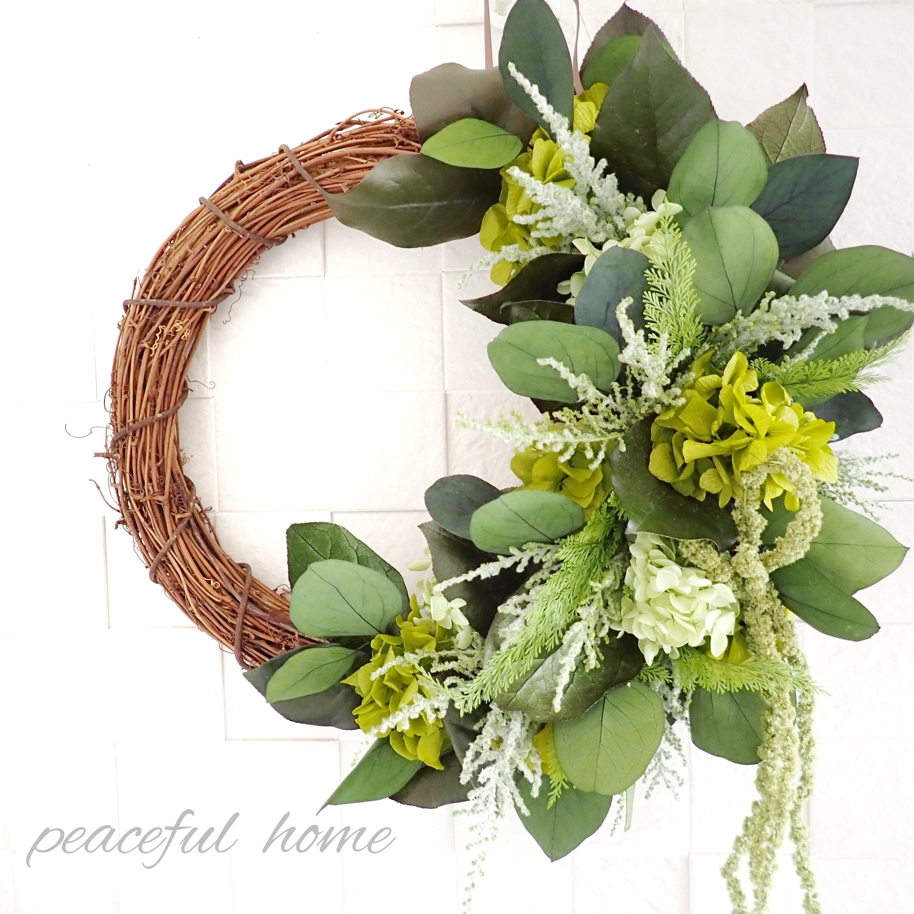 アジサイ、レモンリーフ、ストーベ、アスパラガスグリーン、ポプラスユーカリ、アマランサス