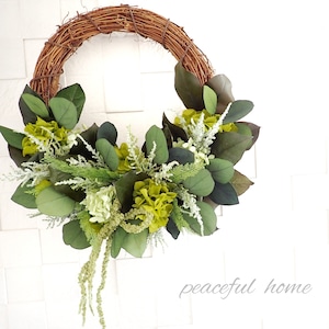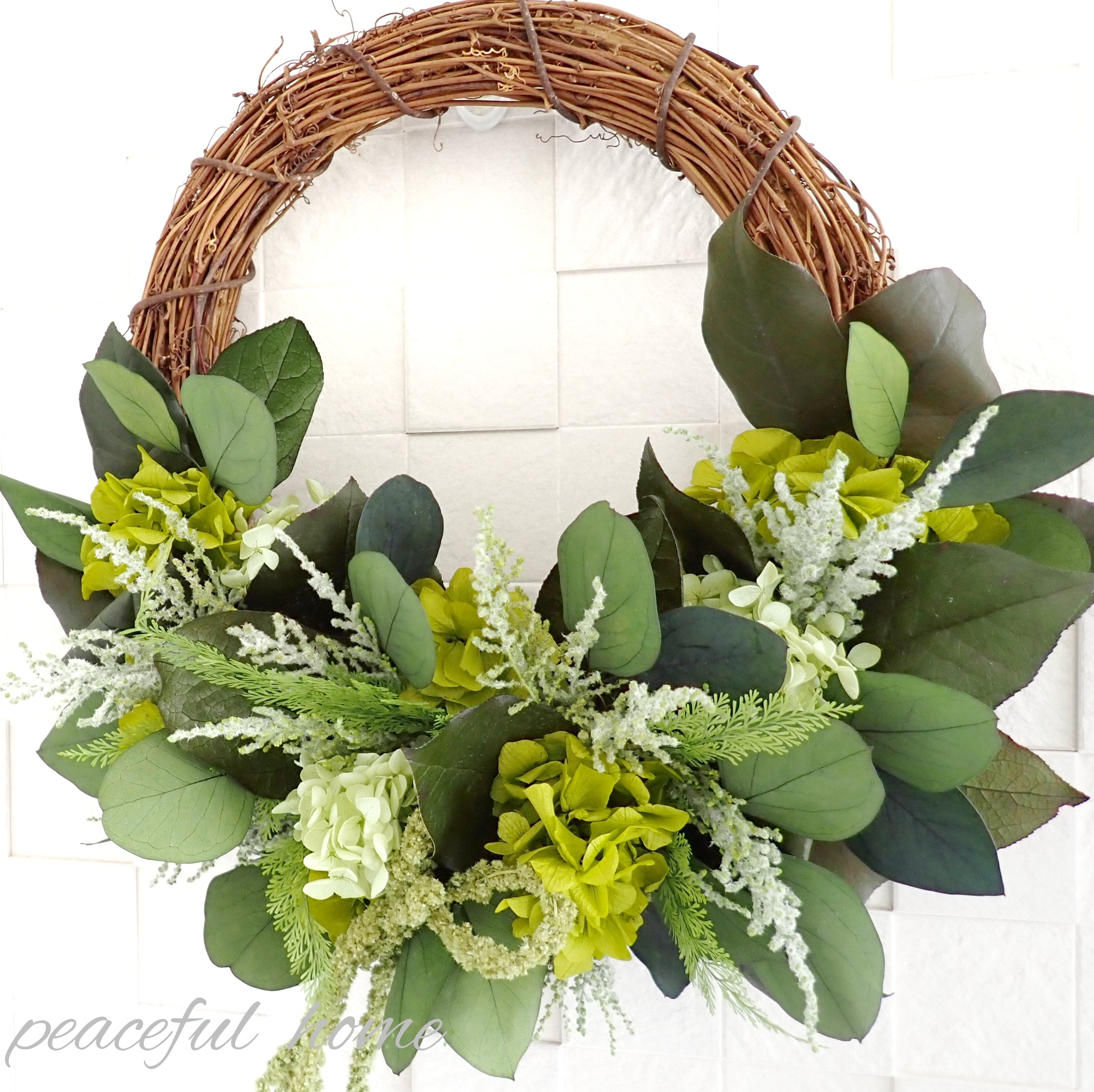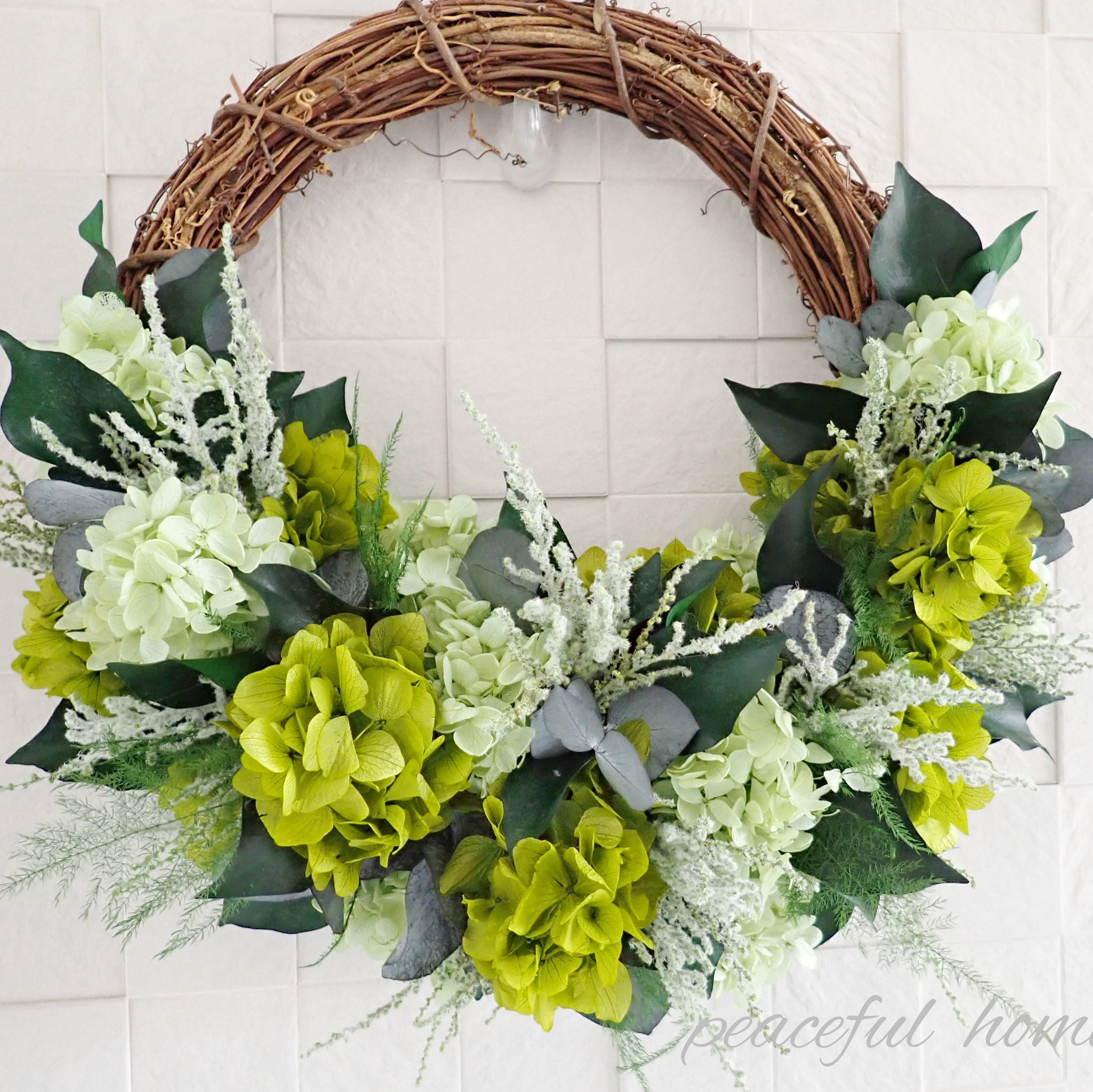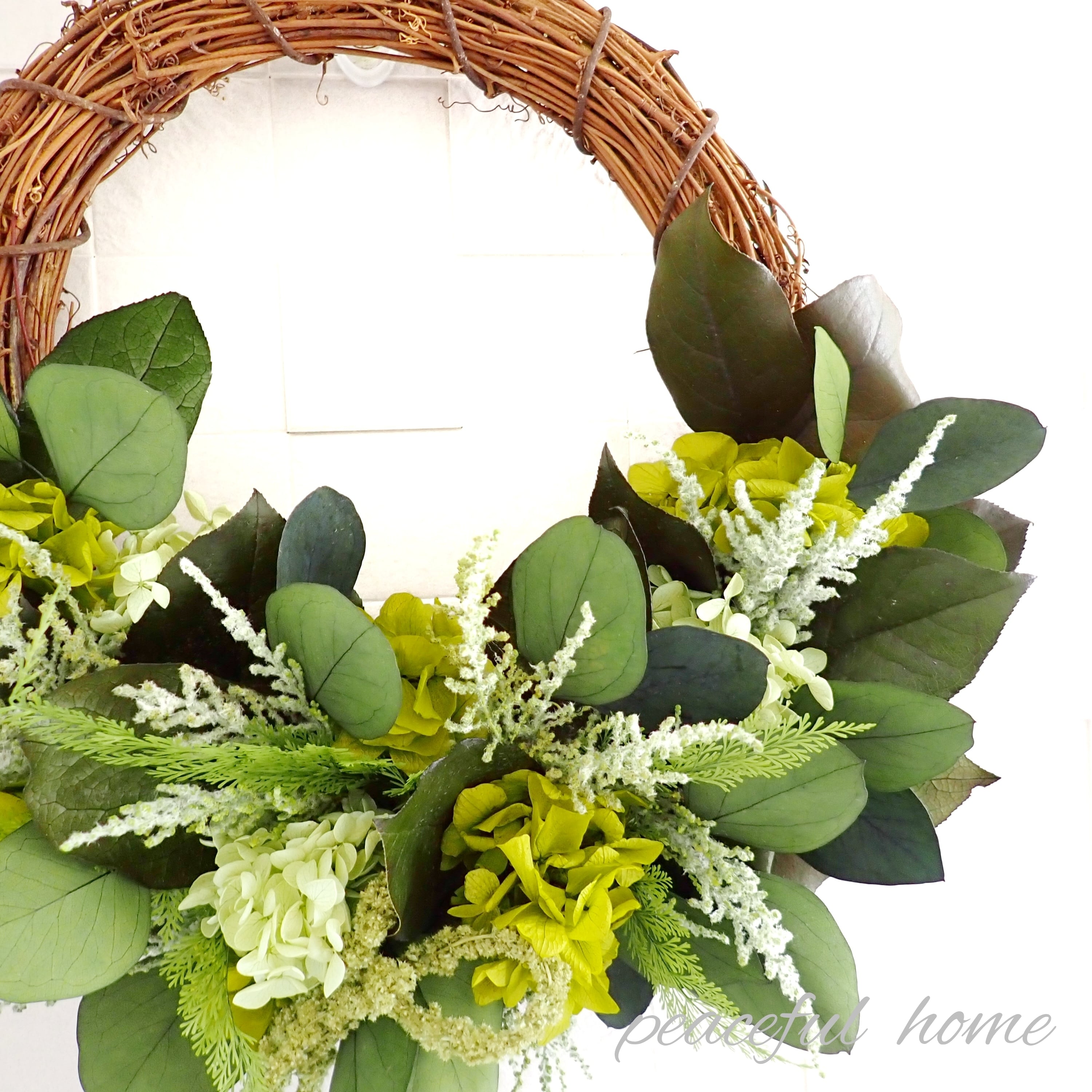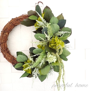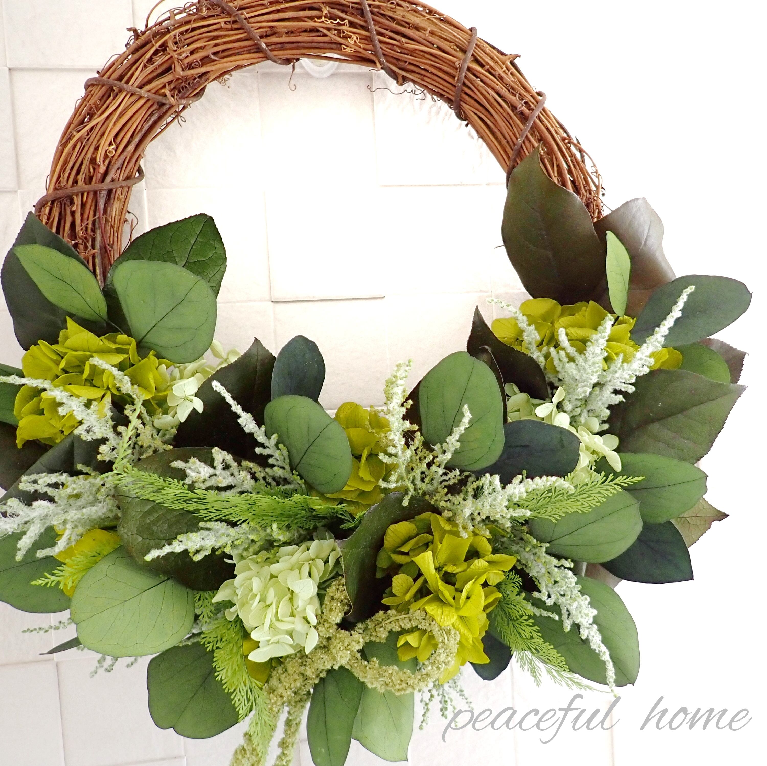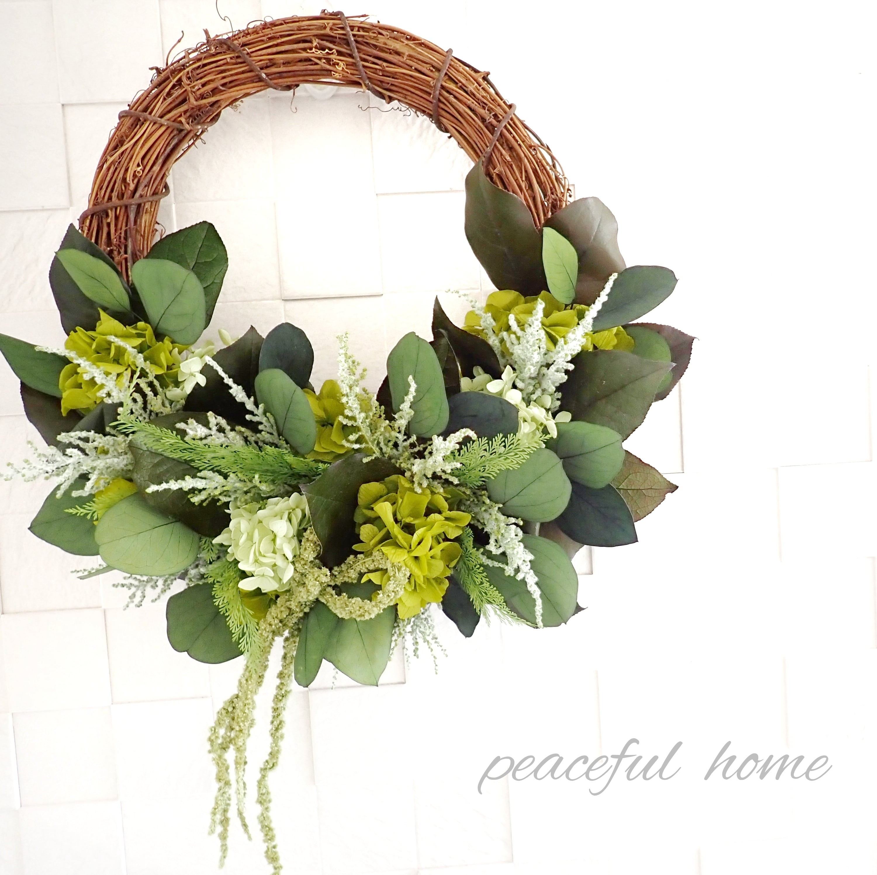 アジサイ、レモンリーフ、ストーベ、アスパラガスグリーン、ポプラスユーカリ、アマランサス