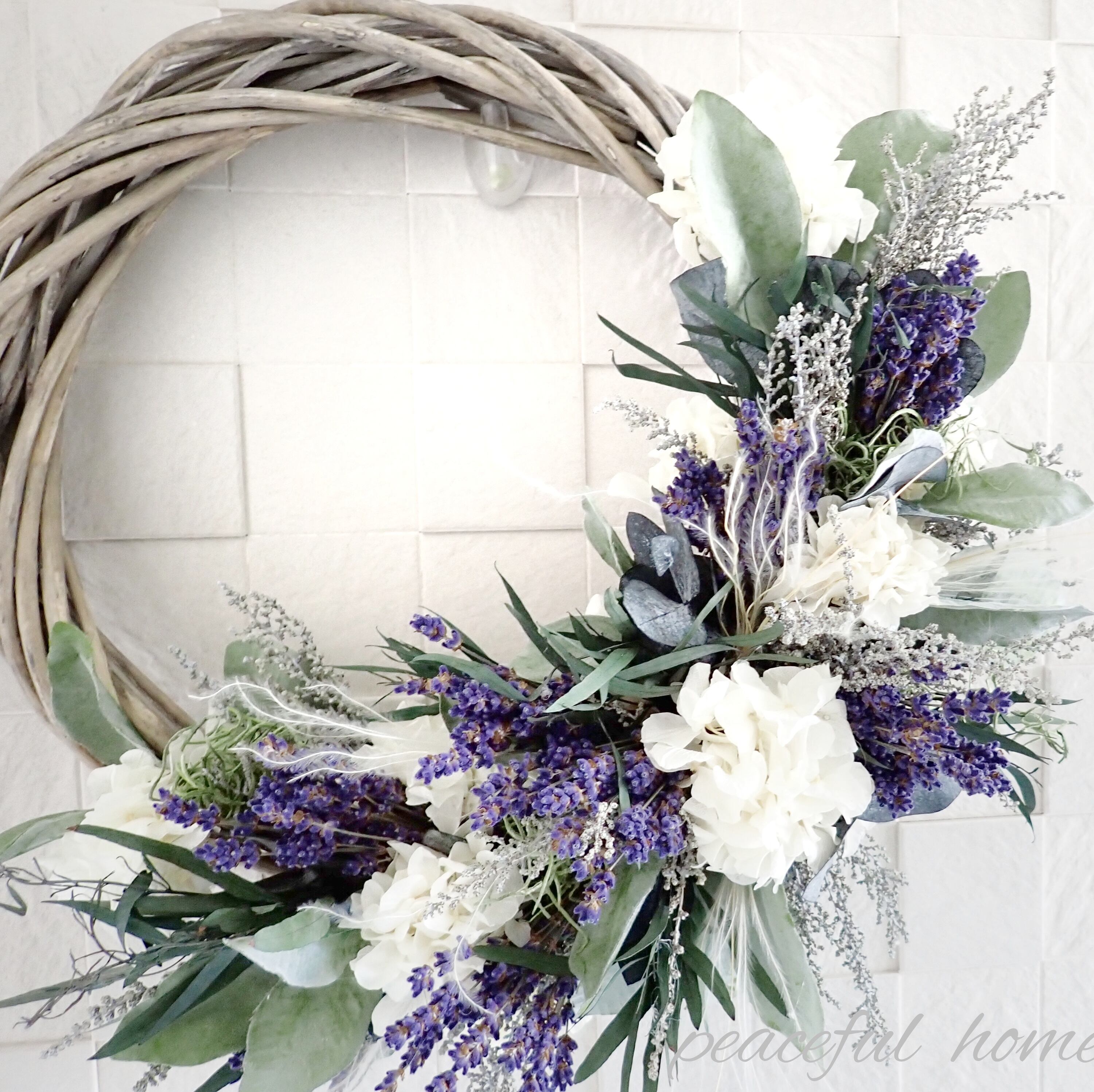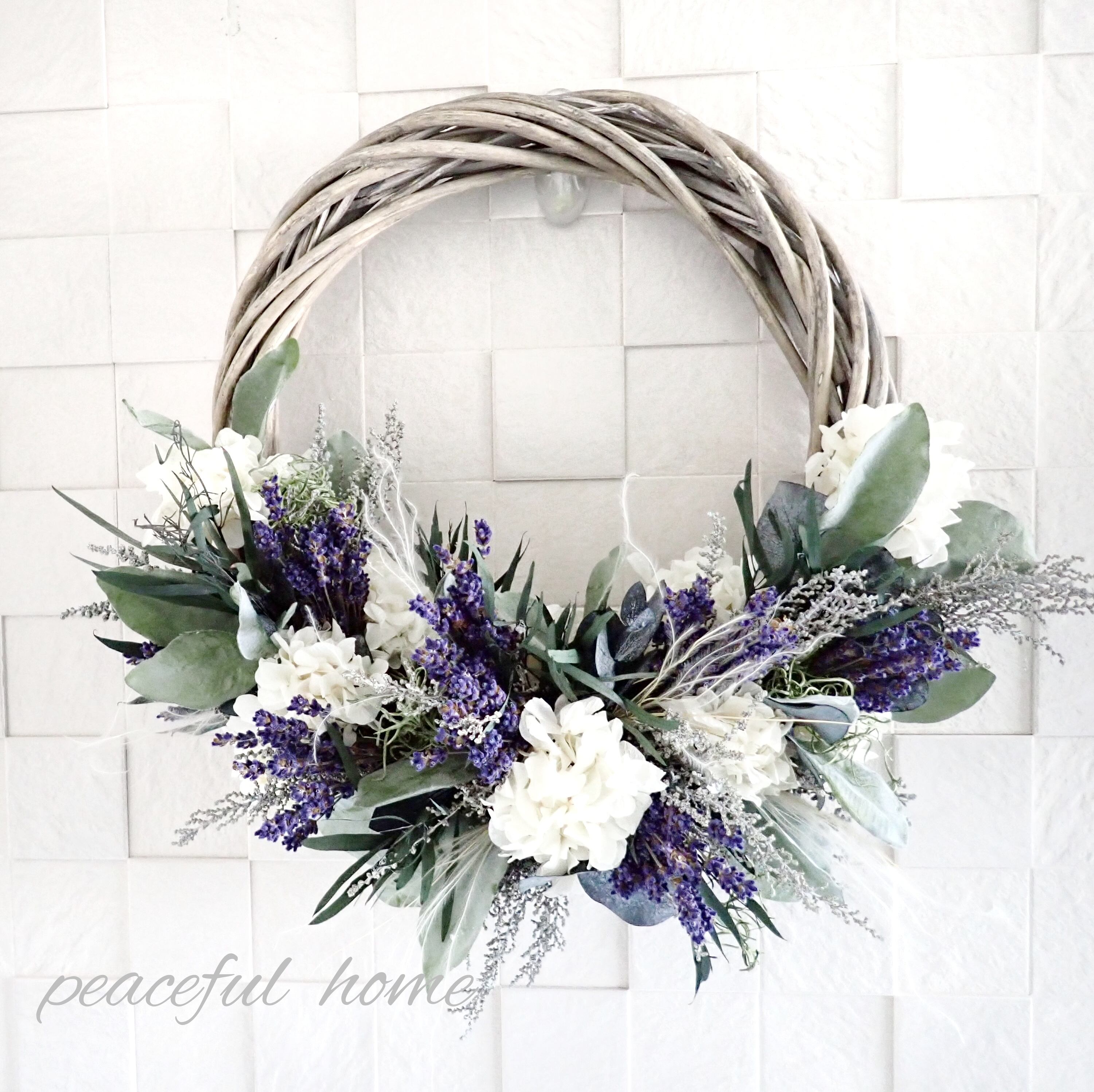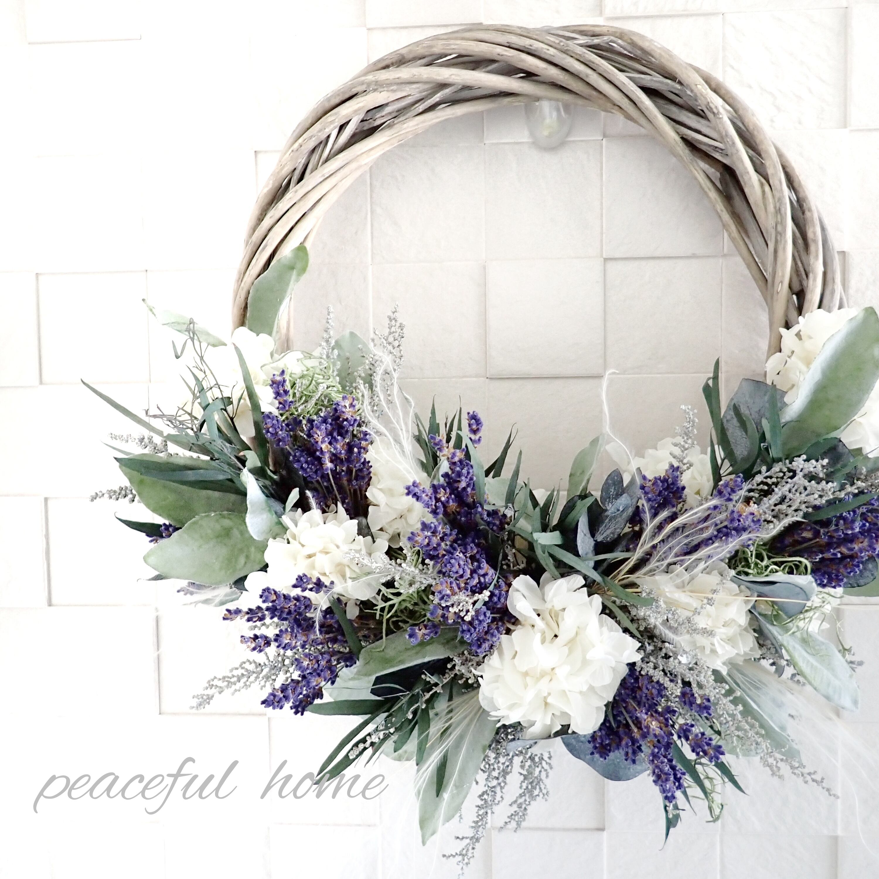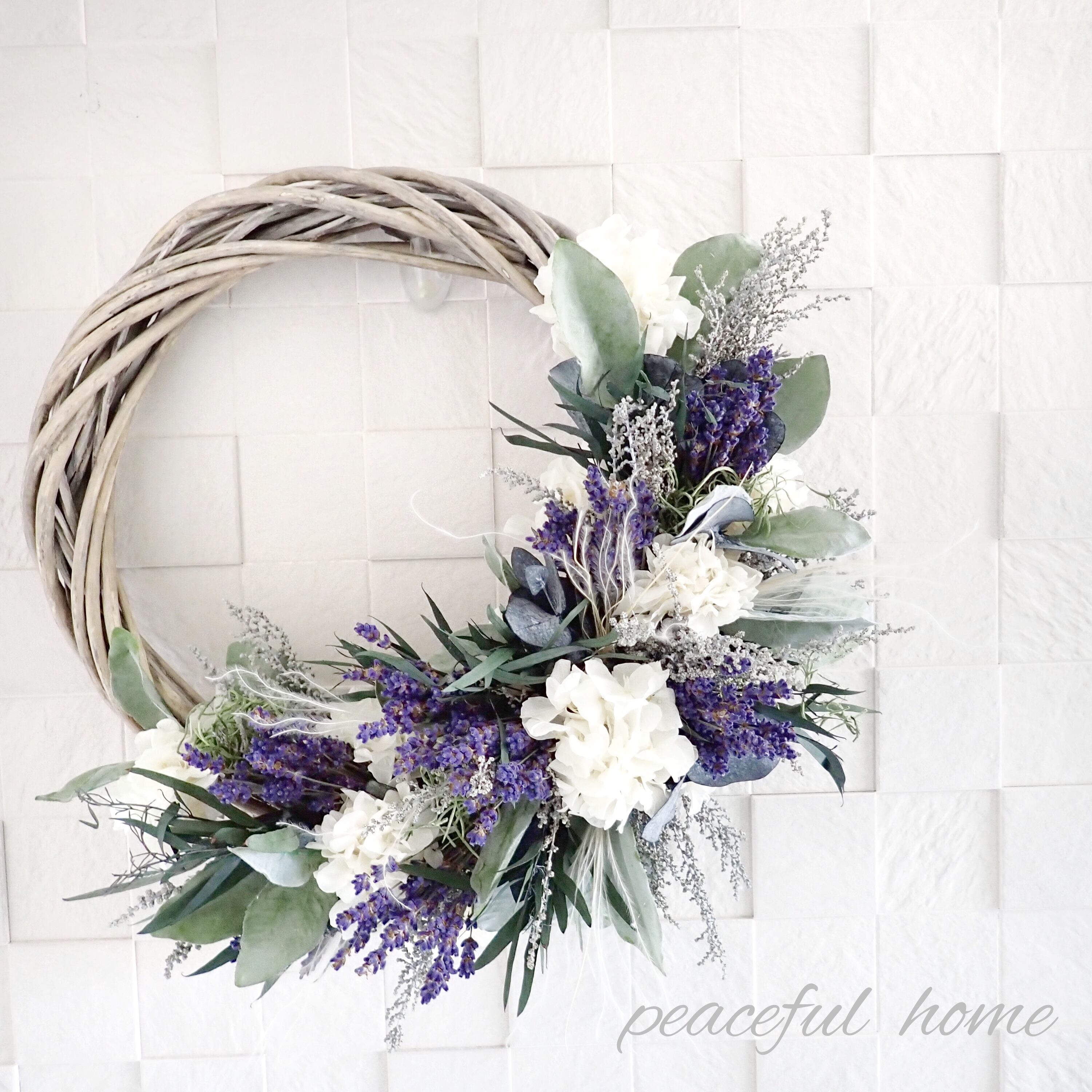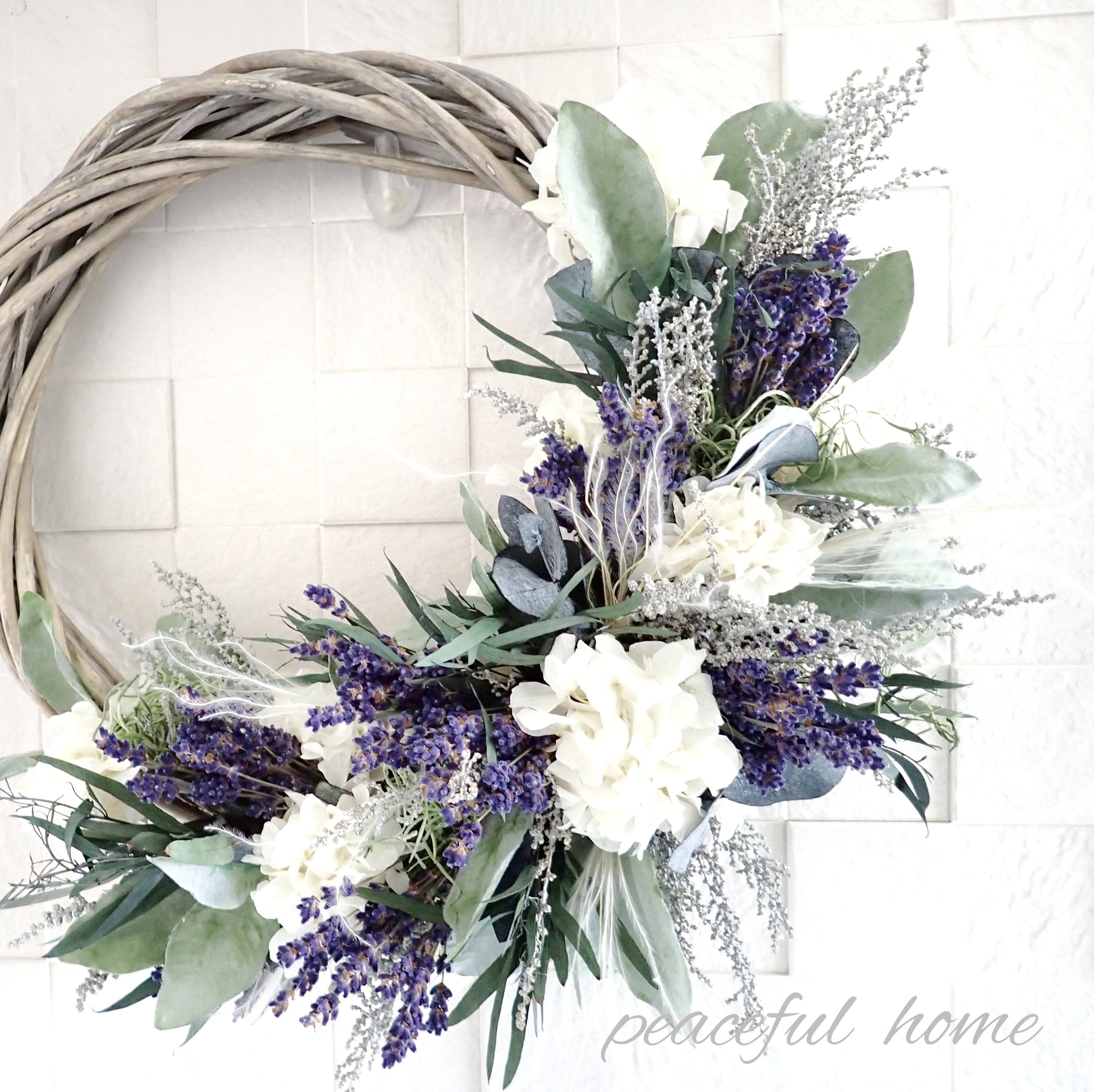 プリザーブドフラワーのアジサイやユーカリなどに、ドライのラベンダーをざっくりとあしらった大きめリース(約35cm)です。