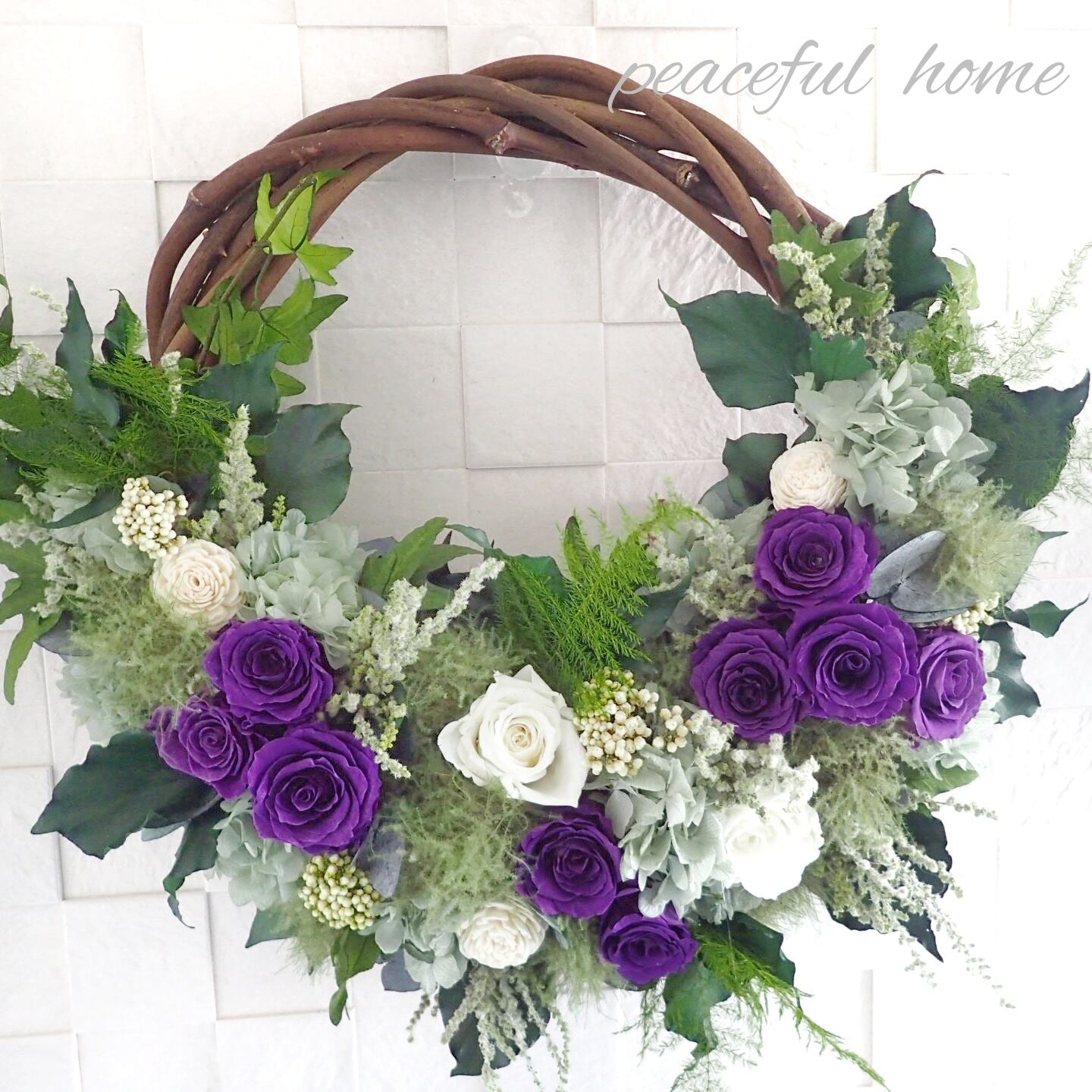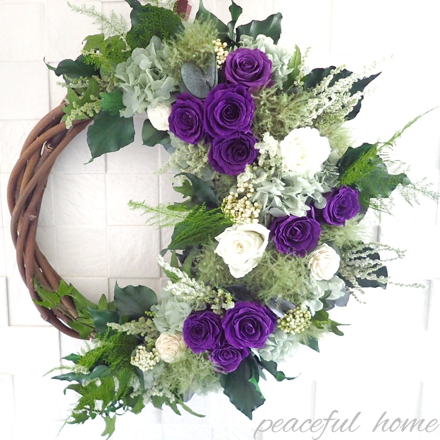 お誕生日祝や新築祝、結婚祝、母の日などはもちろん、長寿を意味する紫を使用したリースは、喜寿祝、古希祝、敬老の日などのギフトにもおすすめです。