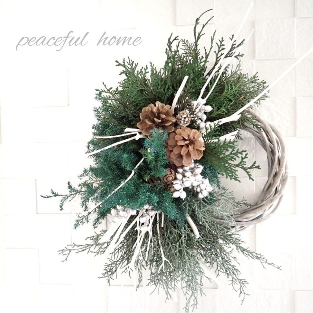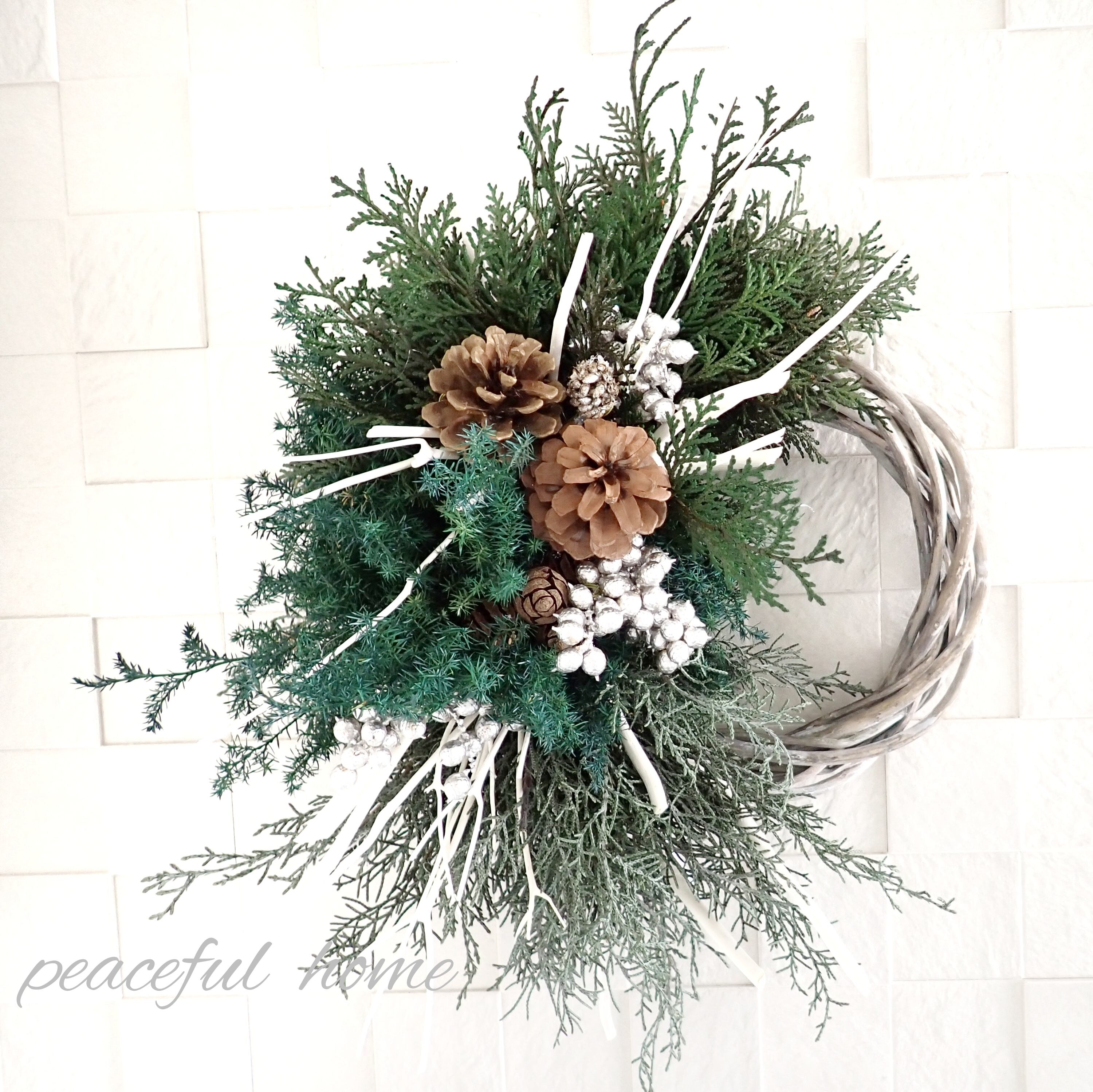 実物も全てプリザーブドフラワーとなっており、針葉樹の香り漂う、ナチュラルなクリスマスリースです。